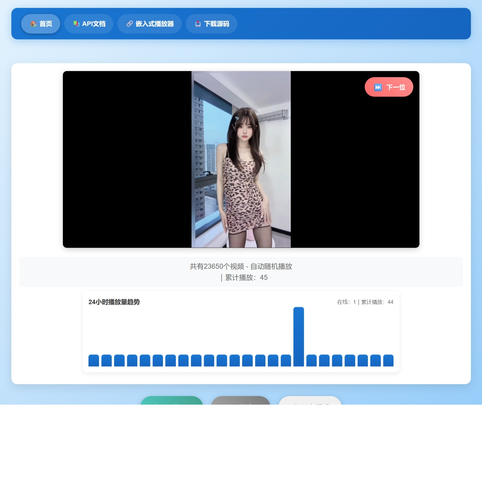 | 随机小姐姐热舞视频系统源码全新UI带后台版v5.0 自适应手机端 更新日志: 1.更新了后台功能,可以自行修改接口 2.支持对外开放API接口功能,支持json和text格式输出 3.修改网站信息,修改账号密码 4.后台统计报表重构版,支持24小时/7天/30天统计播放量 5.支持前台设置广告,可一件深色护眼爽看模式 6.加入嵌入式播放代码功能,在线播放统计,在线人数等 |