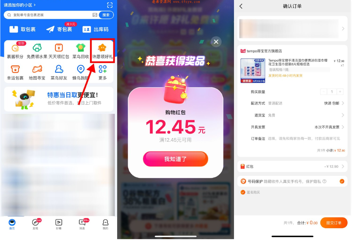2、菜鸟APP首页“许愿领好礼”进入随便选个奖品