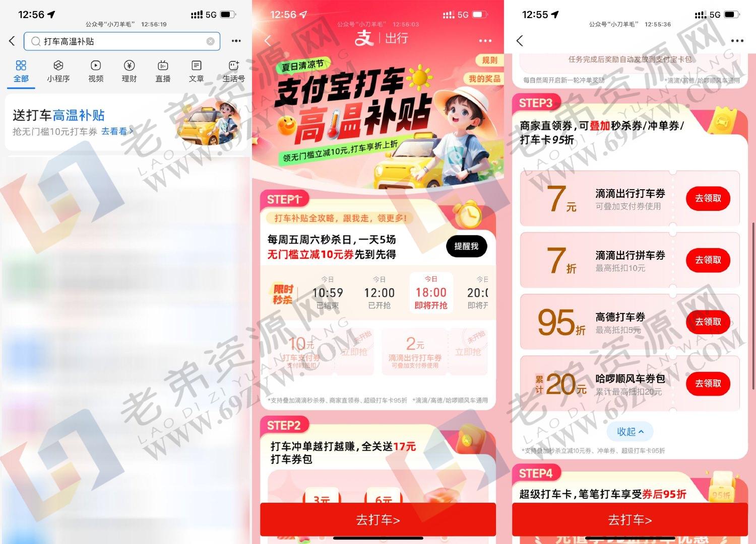 支付宝搜索“打车高温补贴”->每周五周六8/12/12/18/20点可抢10元打车券,下拉还能直接领7元滴滴打车券