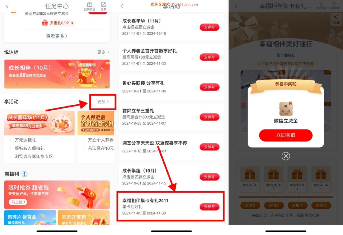 工行APP搜索“任务中心”->享活动“更多”->幸福相伴集卡有礼->简单浏览抽5~66元立减金