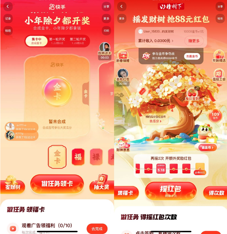 快手搜索“集福卡”进入活动,左侧可切换“集福卡、发财树”共2个活动